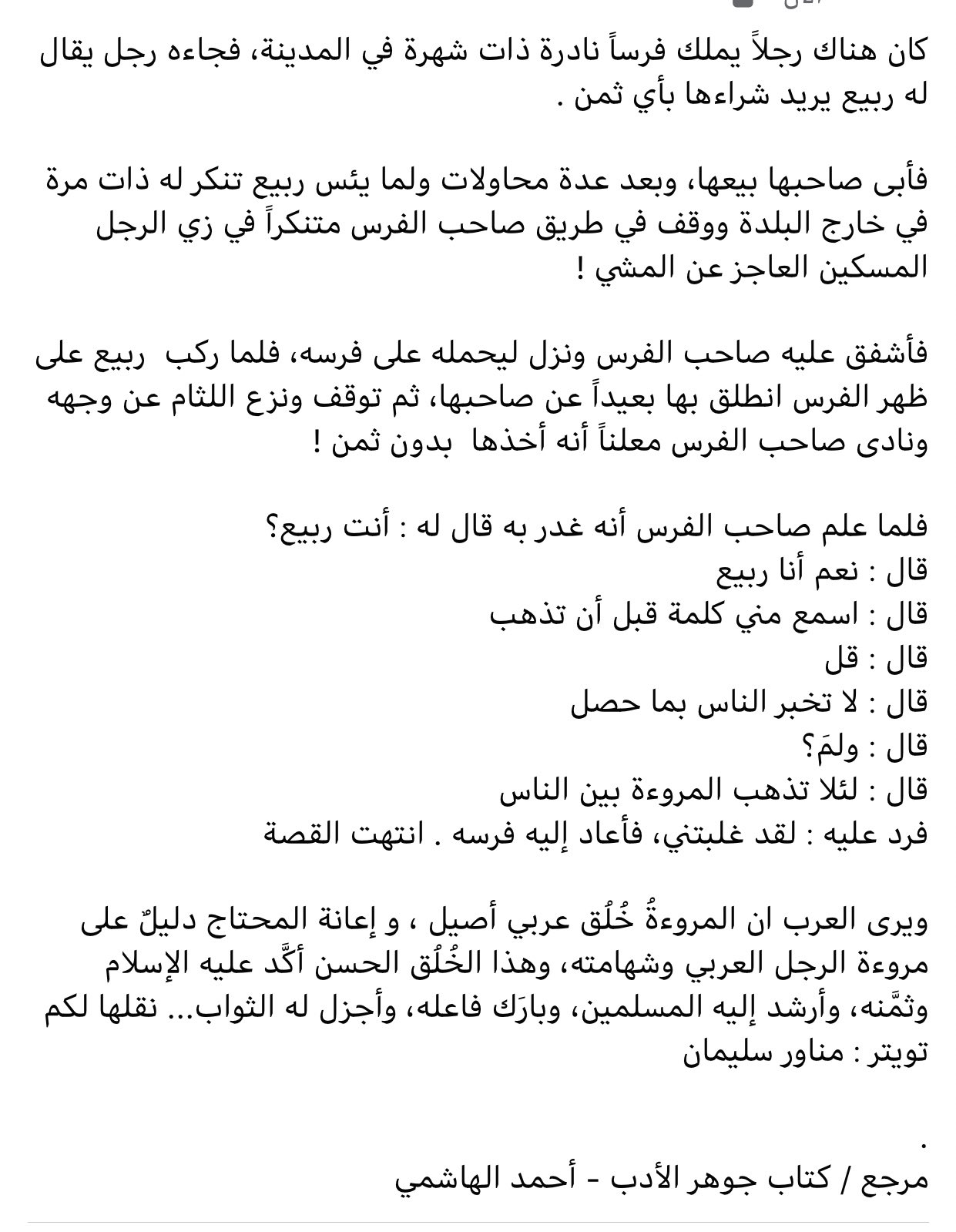 مناور سليمان On Twitter المروءة هي خ ل ق عربي أصيل قصتنا تقول كان هناك رجلا يملك فرسا نادرة ذات شهرة في المدينة فجاءه رجل يقال له ربيع يريد شراءها بأي ثمن